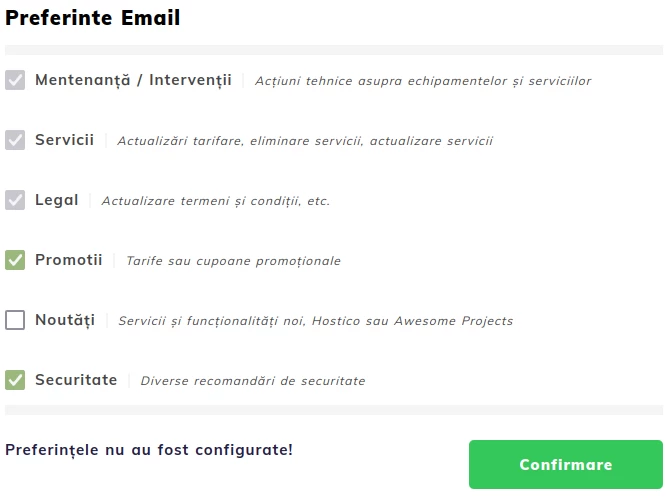 A értesítések aktiválása vagy deaktiválása a Hostico ügyfélszámlájából végezhető el, a Felhasználó szakaszra belépve.