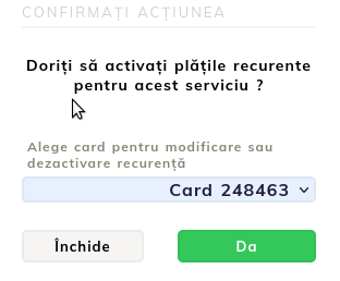 - A megnyílt ablak arra kér minket, hogy válasszunk egy mentett kártyát a fiókban. Kiválasztjuk azt a kártyát, amelyről a pénzösszeget le szeretnénk vonni, majd rákattintunk a IGEN gombra. Ha a művelet sikeres volt, akkor a "Ismétlődő fizetés aktiválva" üzenet jelenik meg.