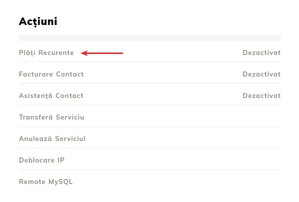 - A Szolgáltatások szekció megjeleníti az aktív hosztolási csomagokat. Kattintson arra a szolgáltatásra, amelyhez ismétlődő kifizetéseket szeretne aktiválni, és megnyílik a szolgáltatáskezelő oldal. A kezelőablakban, az Akciók szekció alatt elérhető az ismétlődő kifizetések aktiválásának lehetősége.
