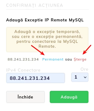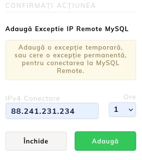 - Jelenleg az IP hozzáadása a távoli MySQL-hez csak a megosztott csomagok esetében engedélyezett, ezért ha VPS-en szeretné hozzáadni, akkor fel kell vennie a kapcsolatot a Hostico műszaki osztályával.