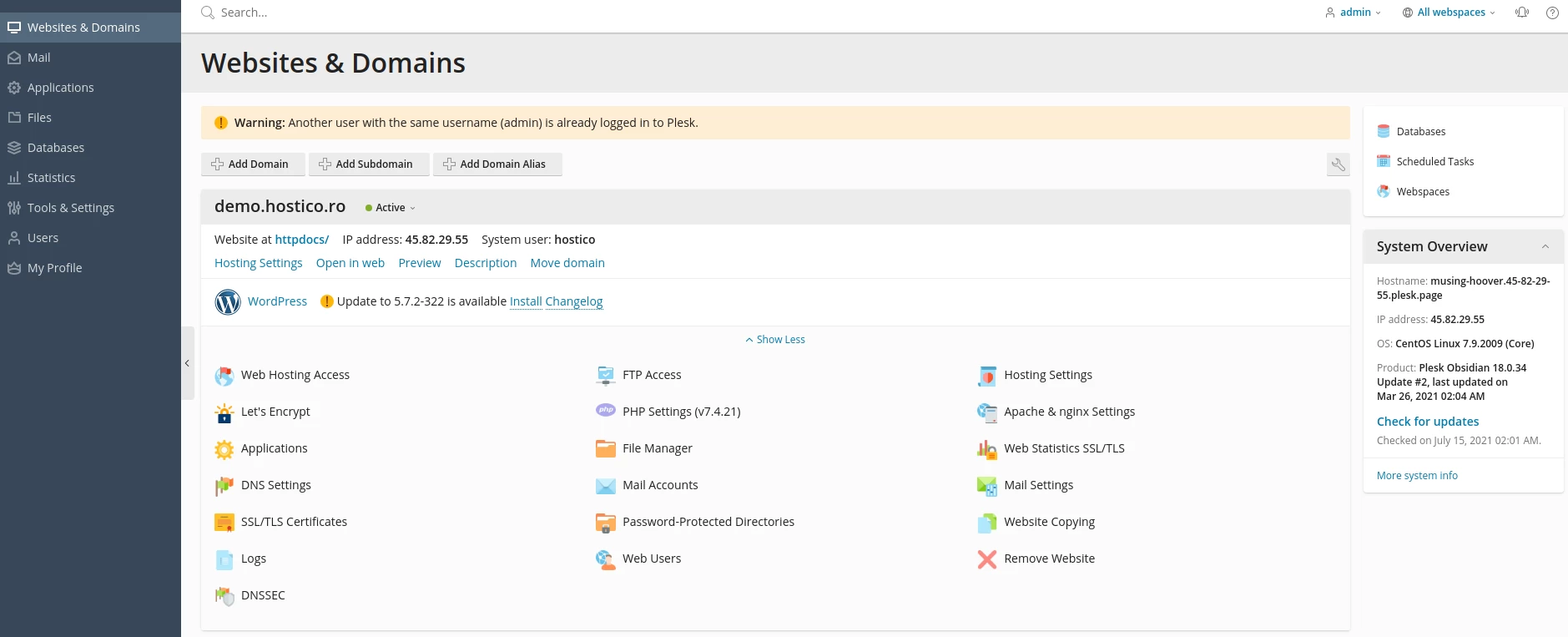 - Ha a hitelesítési folyamat sikeres volt, megnyílik a Plesk vezérlőpult oldala a megfelelő hosztoláshoz.