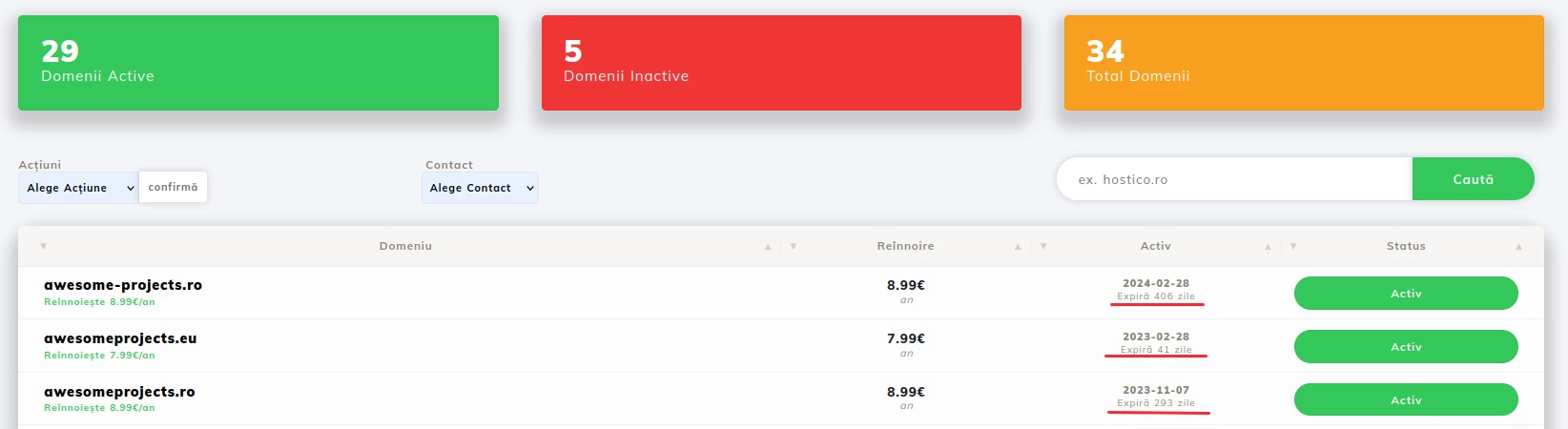 - Itt megtekintheti a birtokolt domaineket, valamint az azokkal kapcsolatos információkat, például: nyilvántartási dátum, lejárati dátum, domain állapot;
