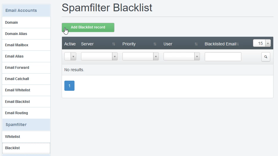 - A Feketelista menü az ISPConfig Spamfilter szekciójában lehetővé teszi számunkra, hogy bármilyen üzenetet, amelyet egy e-mail fiókból kaptunk, spamként jelöljünk meg, függetlenül attól, hogy az valóban spam-e vagy sem.