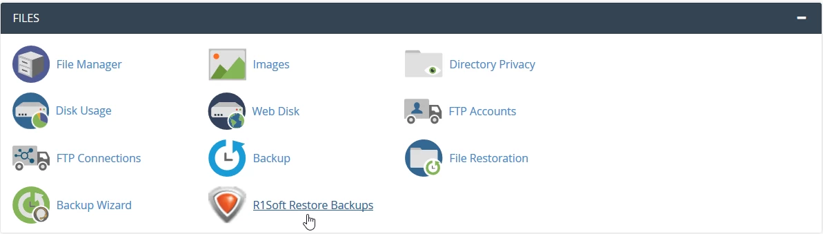 - Miután hozzáfértünk a vezérlőpulthoz, elmegyünk a Fájlok szekcióhoz, és rákattintunk a R1soft Visszaállítási Biztonsági Mentésekre.