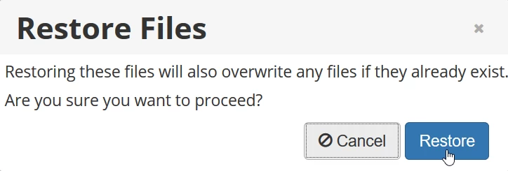 - A figyelmeztető üzenet fogad majd minket, amely tájékoztat arról, hogy a kiválasztott mappában lévő meglévő fájlok helyettesítve lesznek a biztonsági mentésből származó fájlokkal. Ha meg szeretnénk tartani a jelenlegi fájlok másolatát, átnevezhetjük a mappát a Fájlkezelő vagy egy FTP kliens segítségével, így a mappa tartalmát nem helyettesítik a biztonsági mentésből származó fájlok (például átnevezhetjük a public_html-t public_html_old-ra).