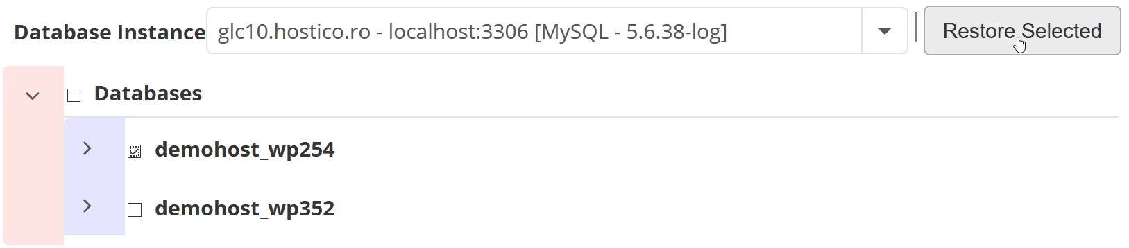 - A továbbiakban a meglévő adatbázisok megjelennek a visszaállítási pontban. Kijelöljük a bal oldalon azt az adatbázist, amelyet vissza szeretnénk állítani, és rákattintunk a Választott visszaállítása gombra az oldal jobb felső sarkában. A visszaállítás felülírja a meglévő adatbázist. Ha nem akarjuk elveszíteni az abban található információkat, letölthetjük a jelenlegi példányt a PhpMyAdmin használatával.